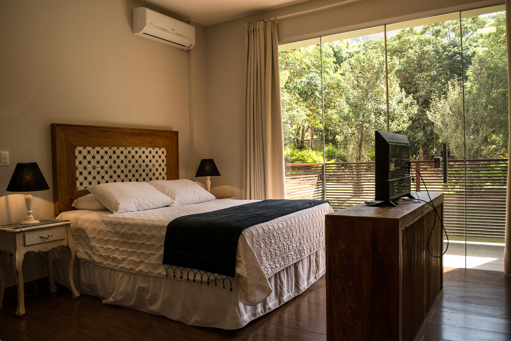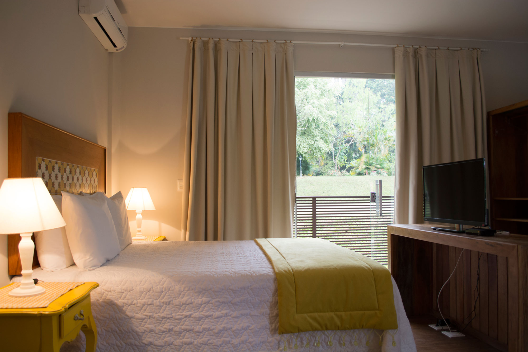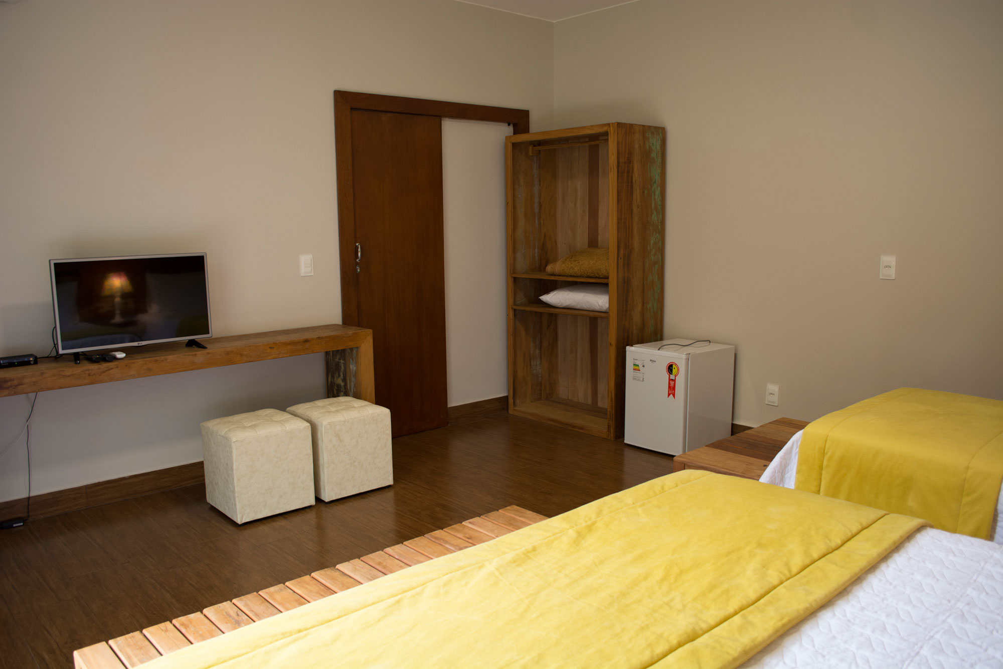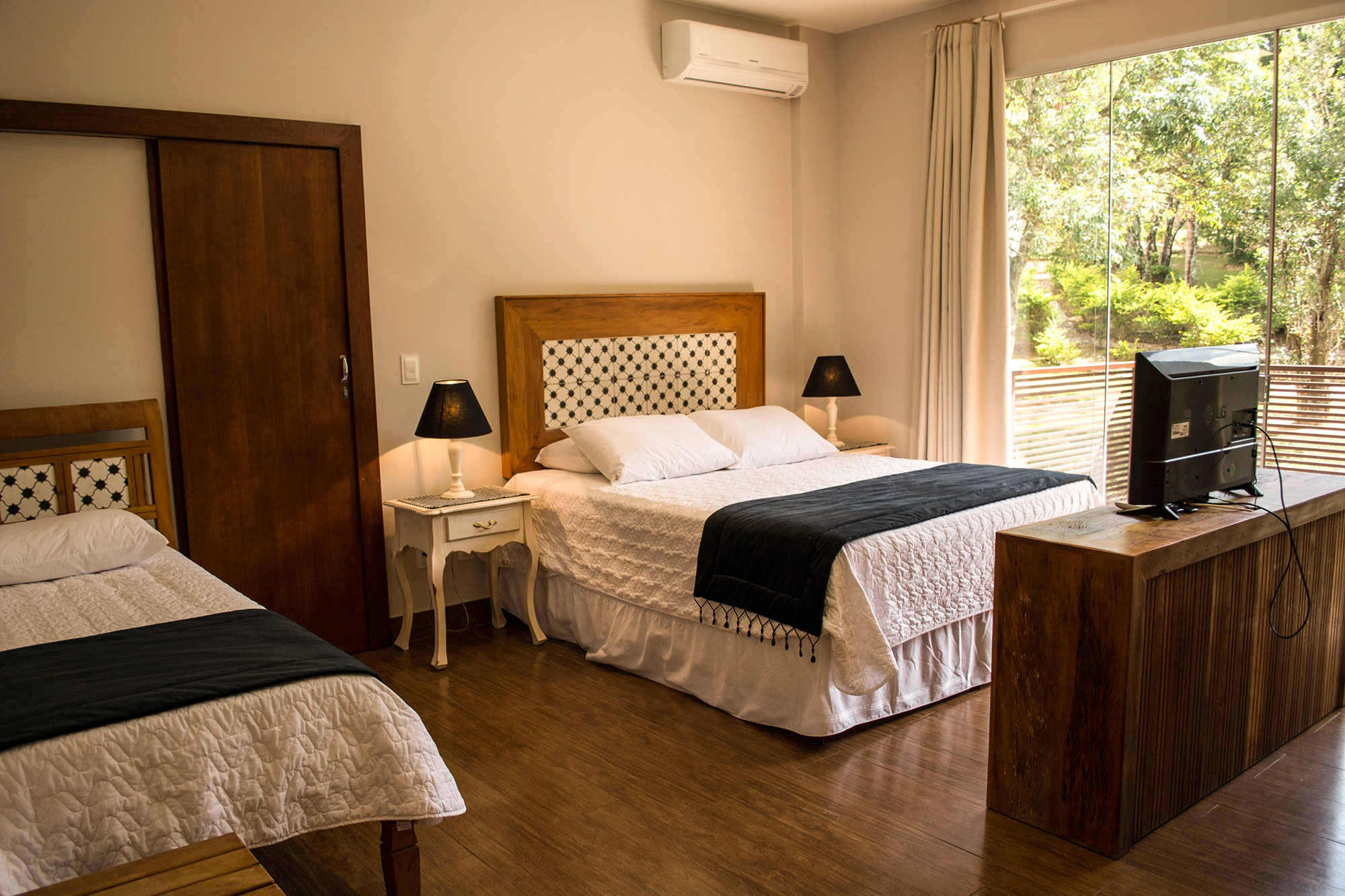 Suíte com cama de casal Queen + 01 cama de solteiro. Ar condicionado quente e frio, TV  LCD 32 polegadas por assinatura, frigobar, banheiro privativo com ducha com aquecimento central , secador de cabelo, ducha higiênica. Localização: Andar térreo e superior (sem vista)