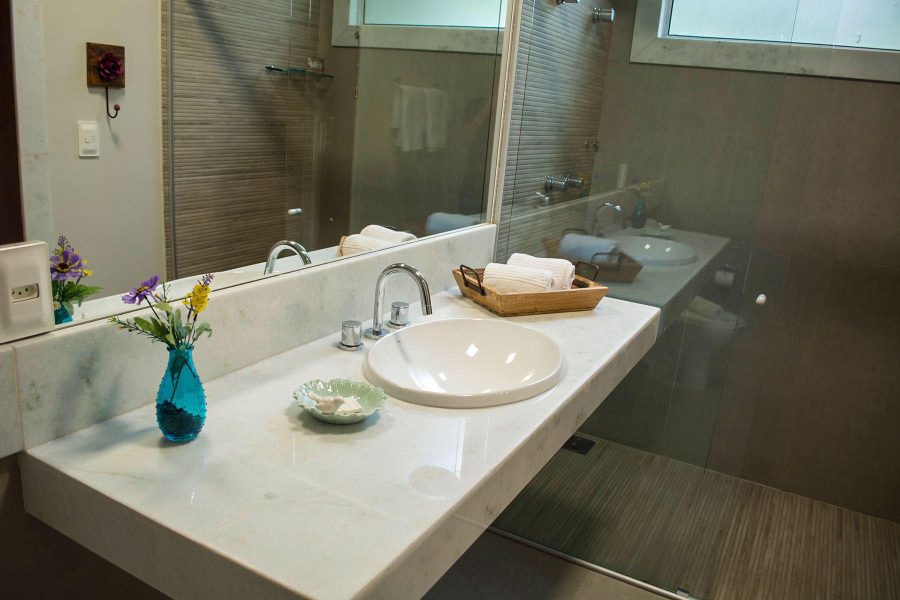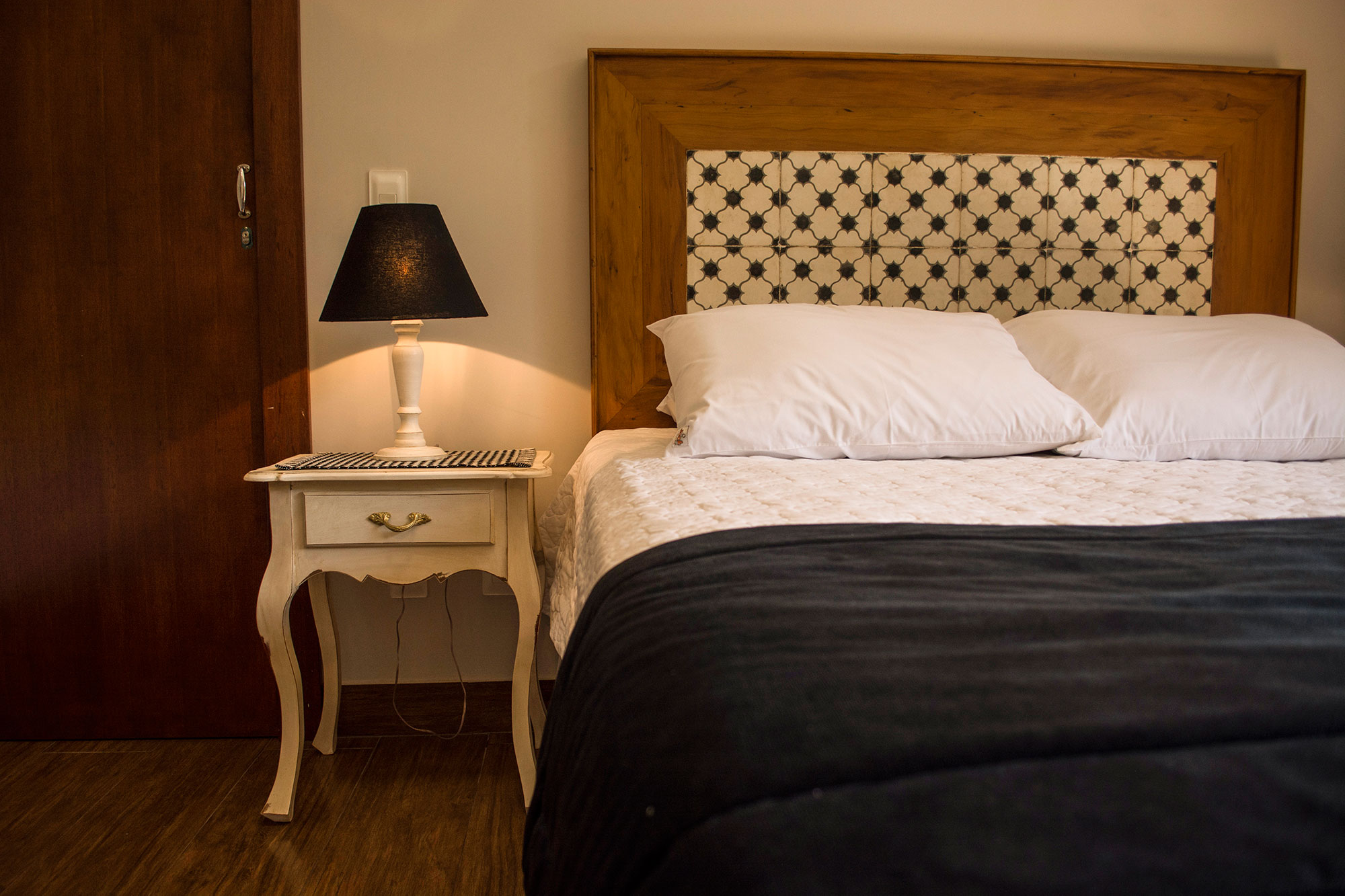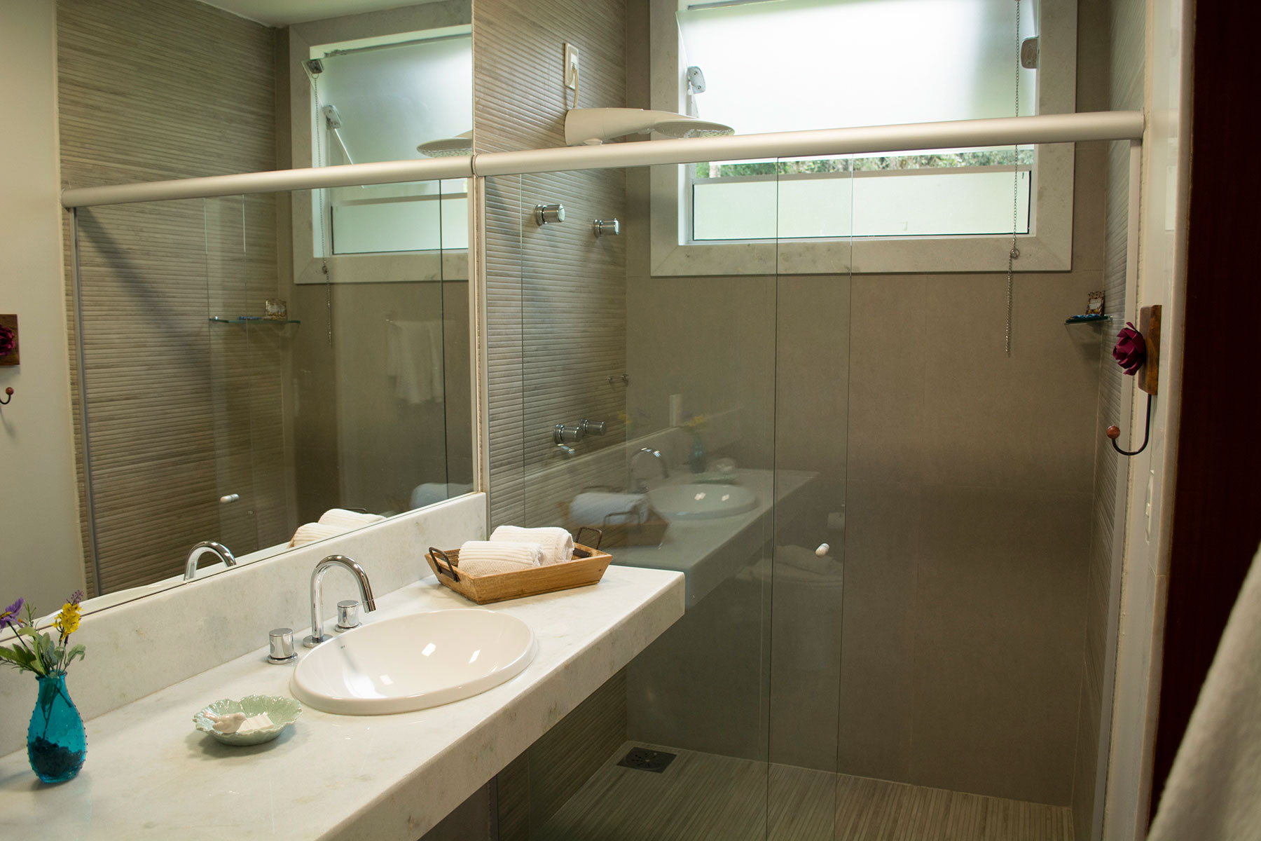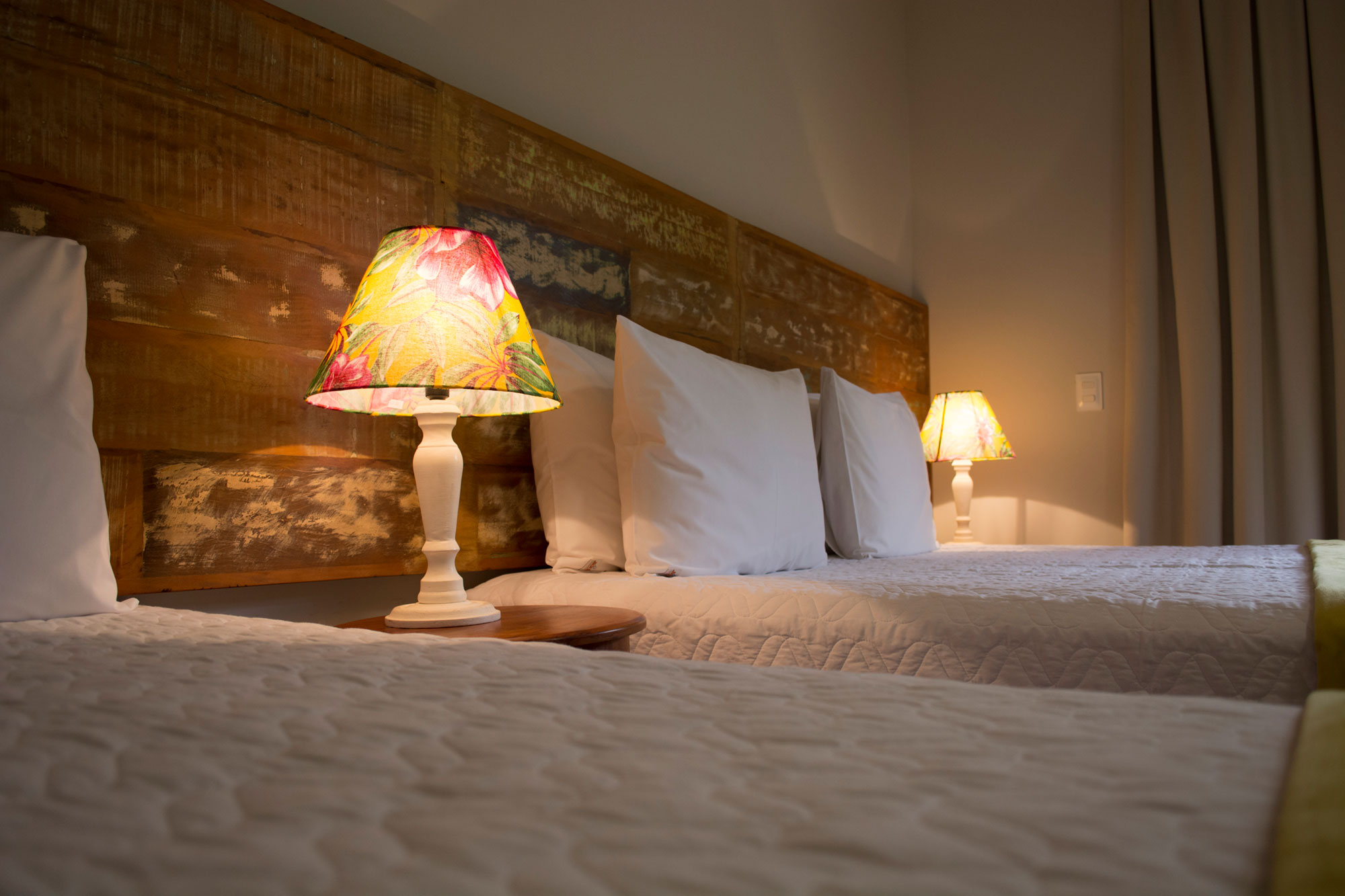 Suíte com cama de casal Queen + 01 cama de solteiro. Ar condicionado quente e frio, TV  LCD 32 polegadas por assinatura, frigobar, banheiro privativo com ducha com aquecimento central , secador de cabelo, ducha higiênica. Localização: Andar térreo e superior (sem vista)