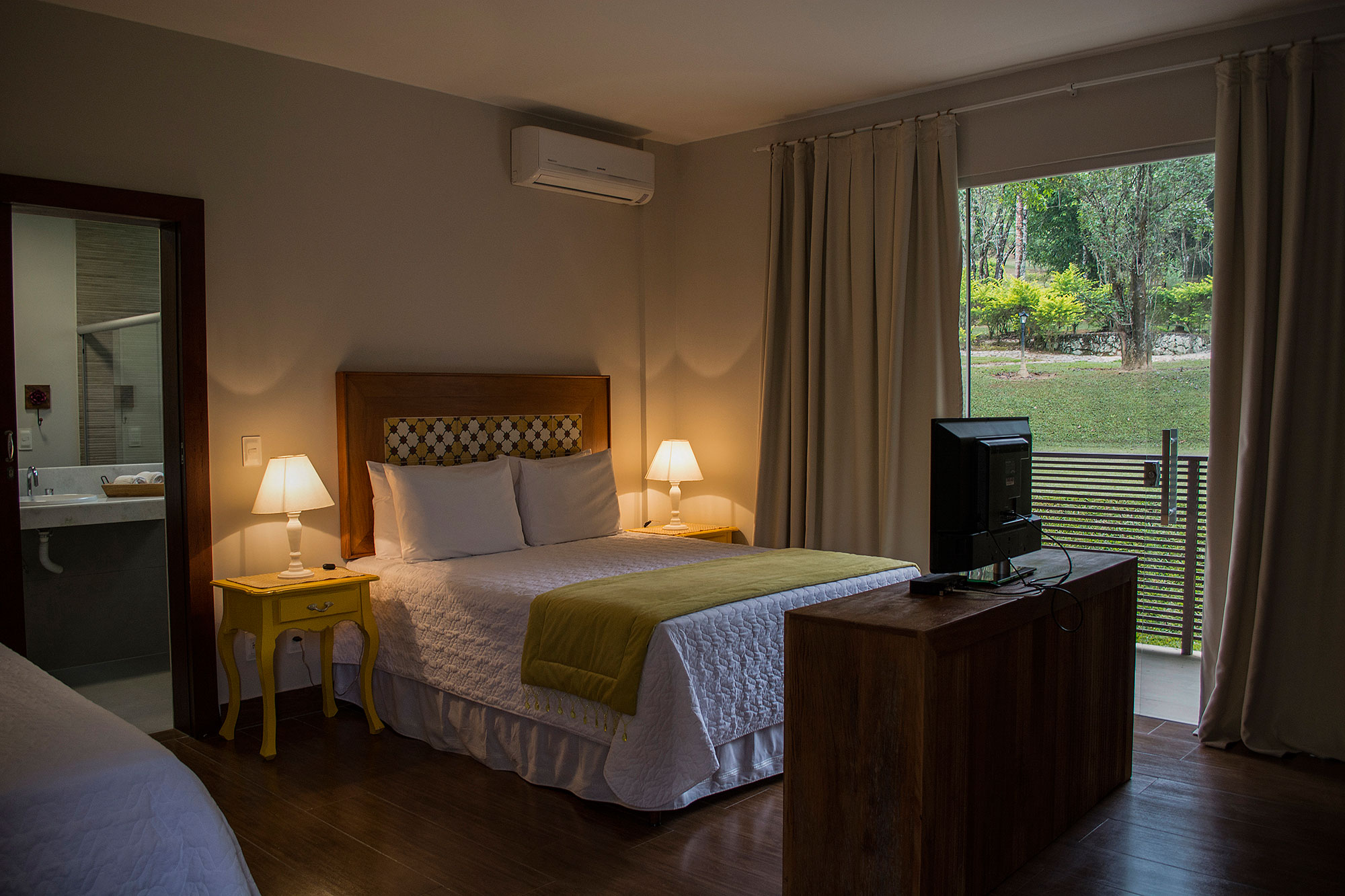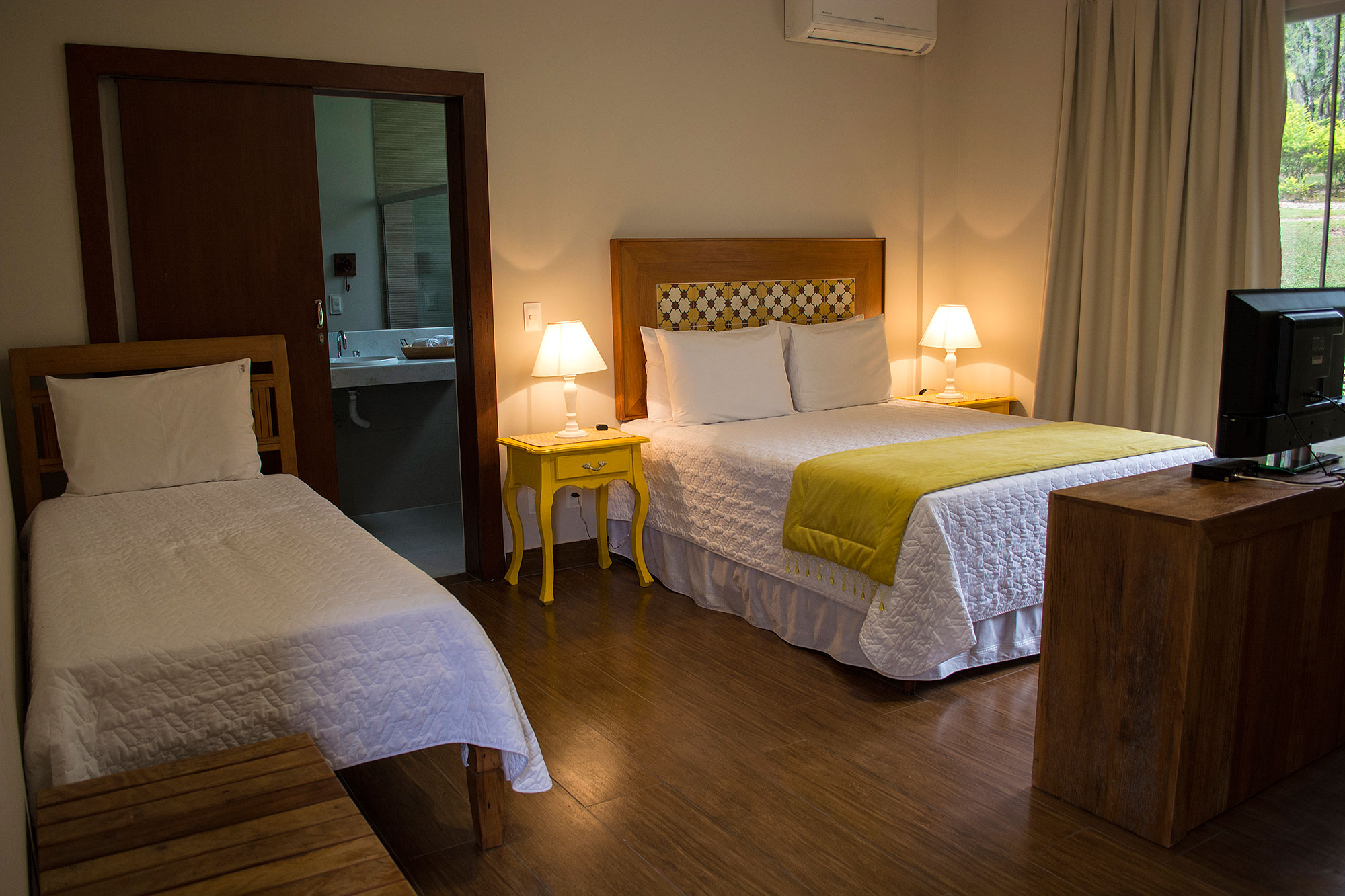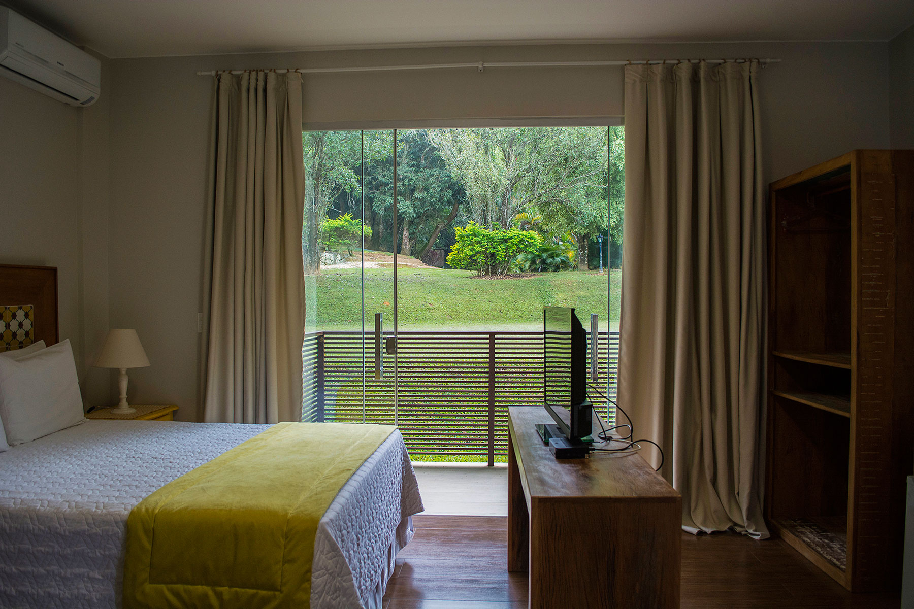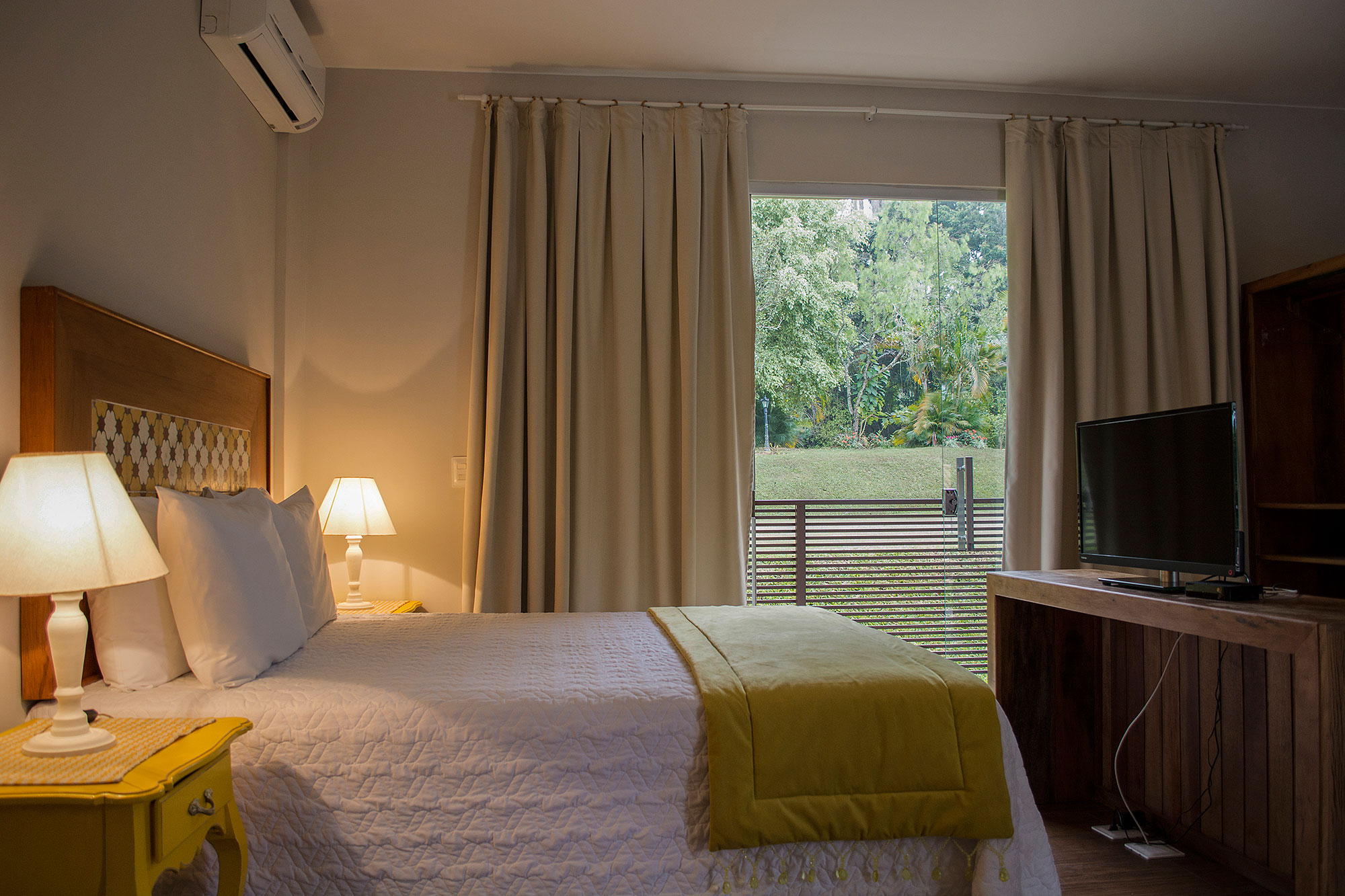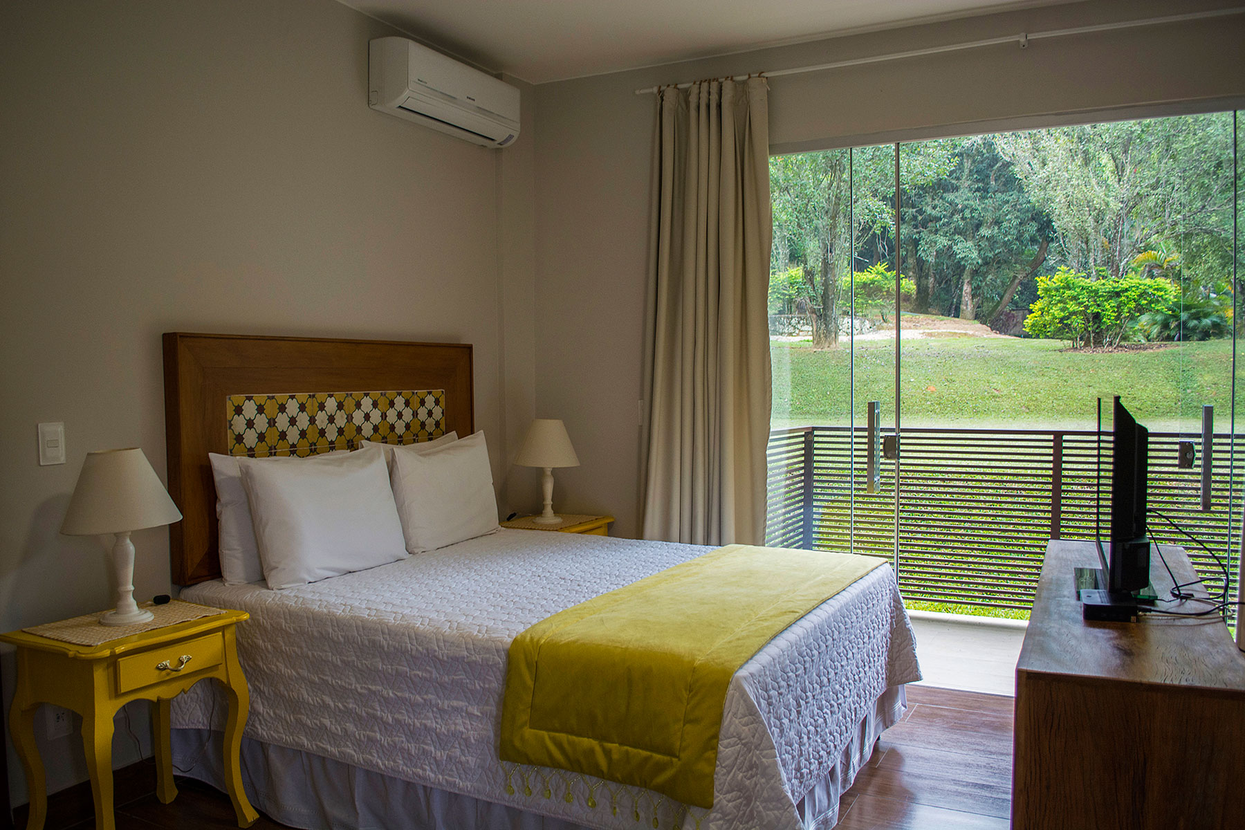 Suíte com cama de casal Queen. Ar condicionado quente e frio, TV LCD 32 polegadas por assinatura, frigobar, banheiro privativo com ducha com aquecimento central, secador de cabelo, ducha higiênica. Localização: Andar térreo e superior (sem vista).