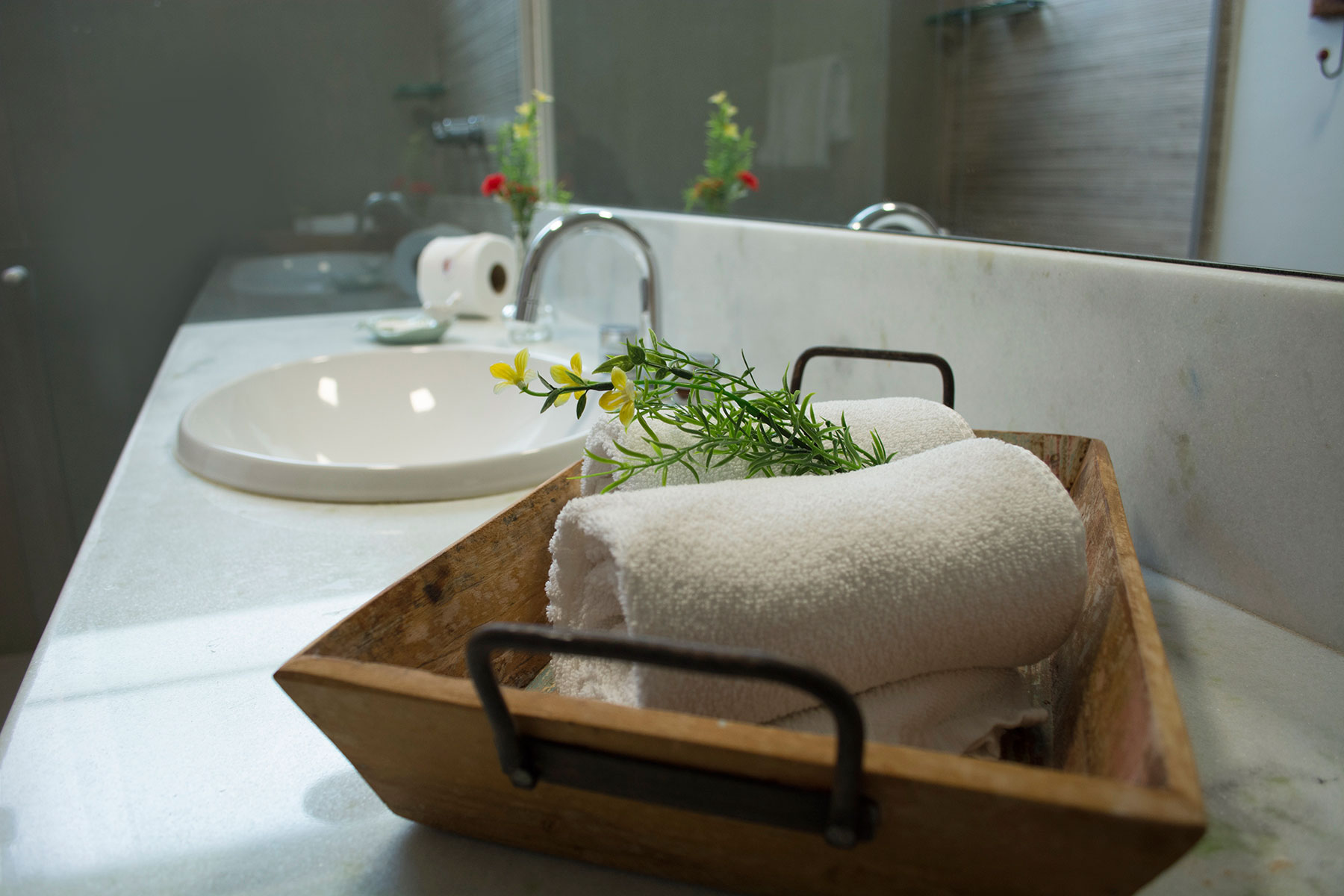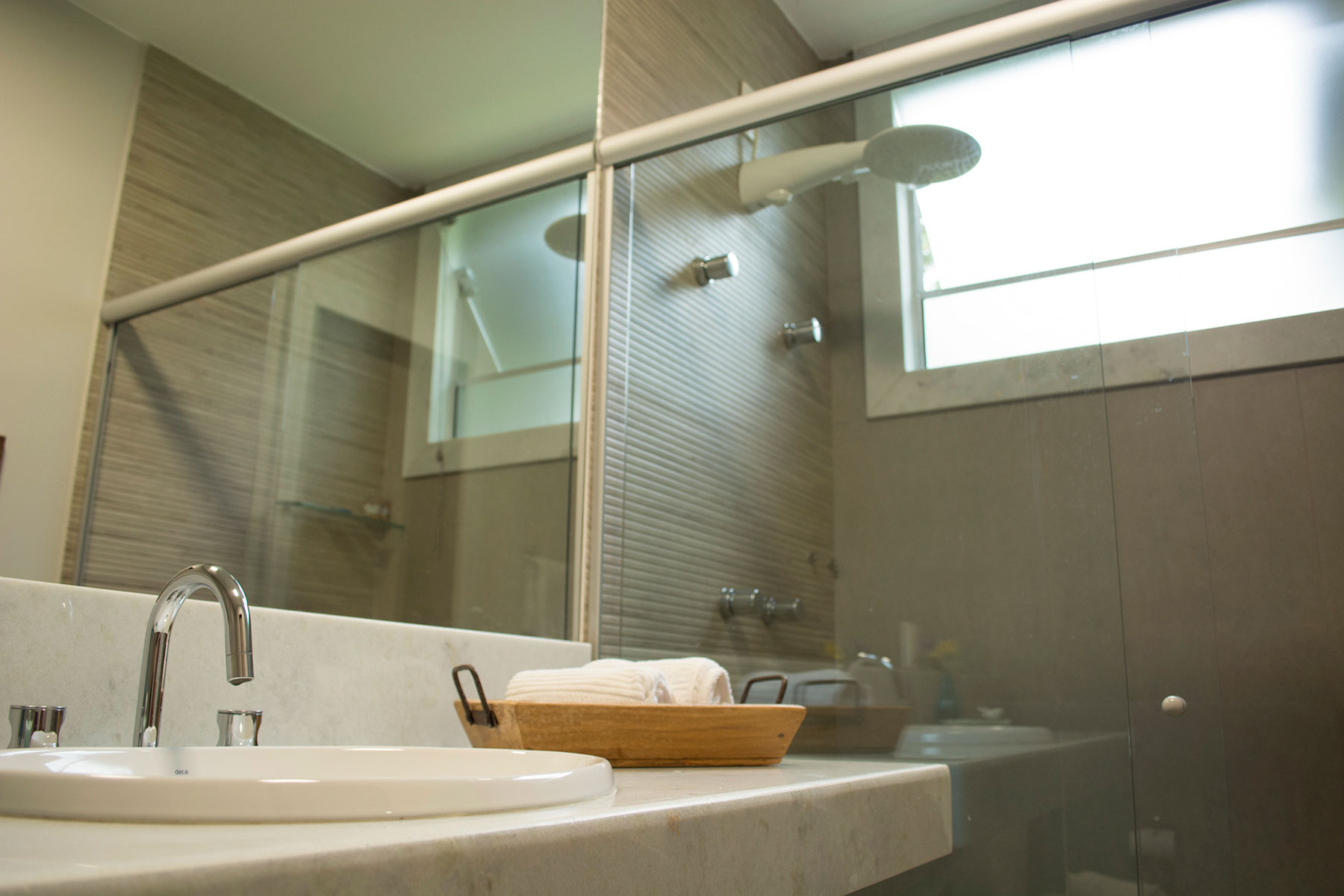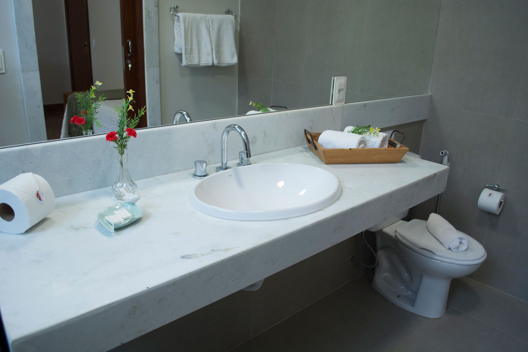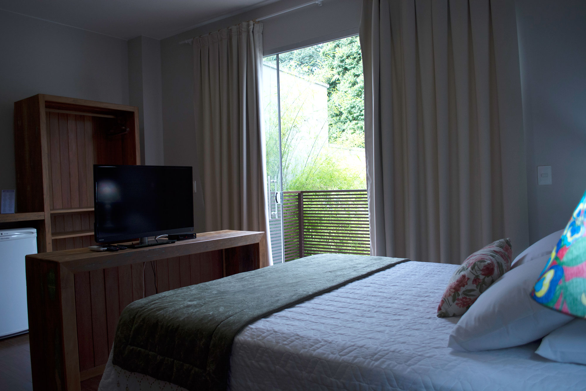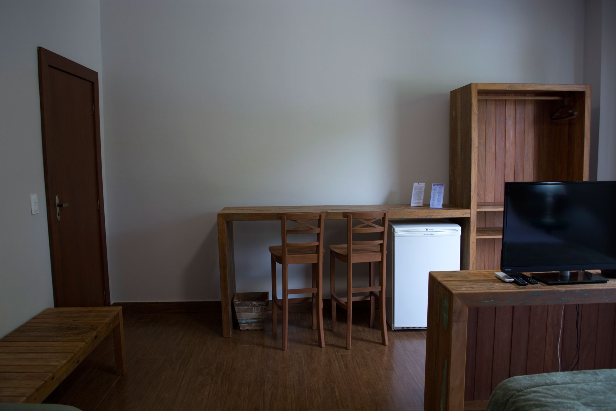 Suíte com cama de casal Queen. Ar condicionado quente e frio, TV LCD 32 polegadas por assinatura, frigobar, banheiro privativo com ducha com aquecimento central, secador de cabelo, ducha higiênica. Localização: Andar térreo e superior (sem vista).